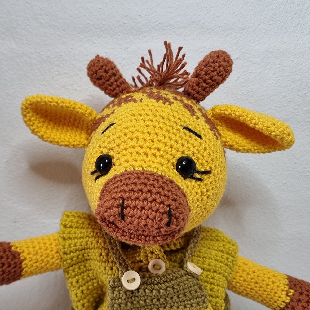 Hæklet Gert Giraf er en håndhæklet ven med masser af charme. Han er udført med bevægelige arme og ben, så han kan både sidde og stå.Gert er klædt i aftagelige bukser og trøje, hvilket gør ham perfekt til rolleleg. Tøjet lukkes med fine træknapper, som tilføjer et rustikt og naturligt udtryk.Giraffen har sikkerhedsøjne, der er fastmonteret og godkendt til brug af børn.