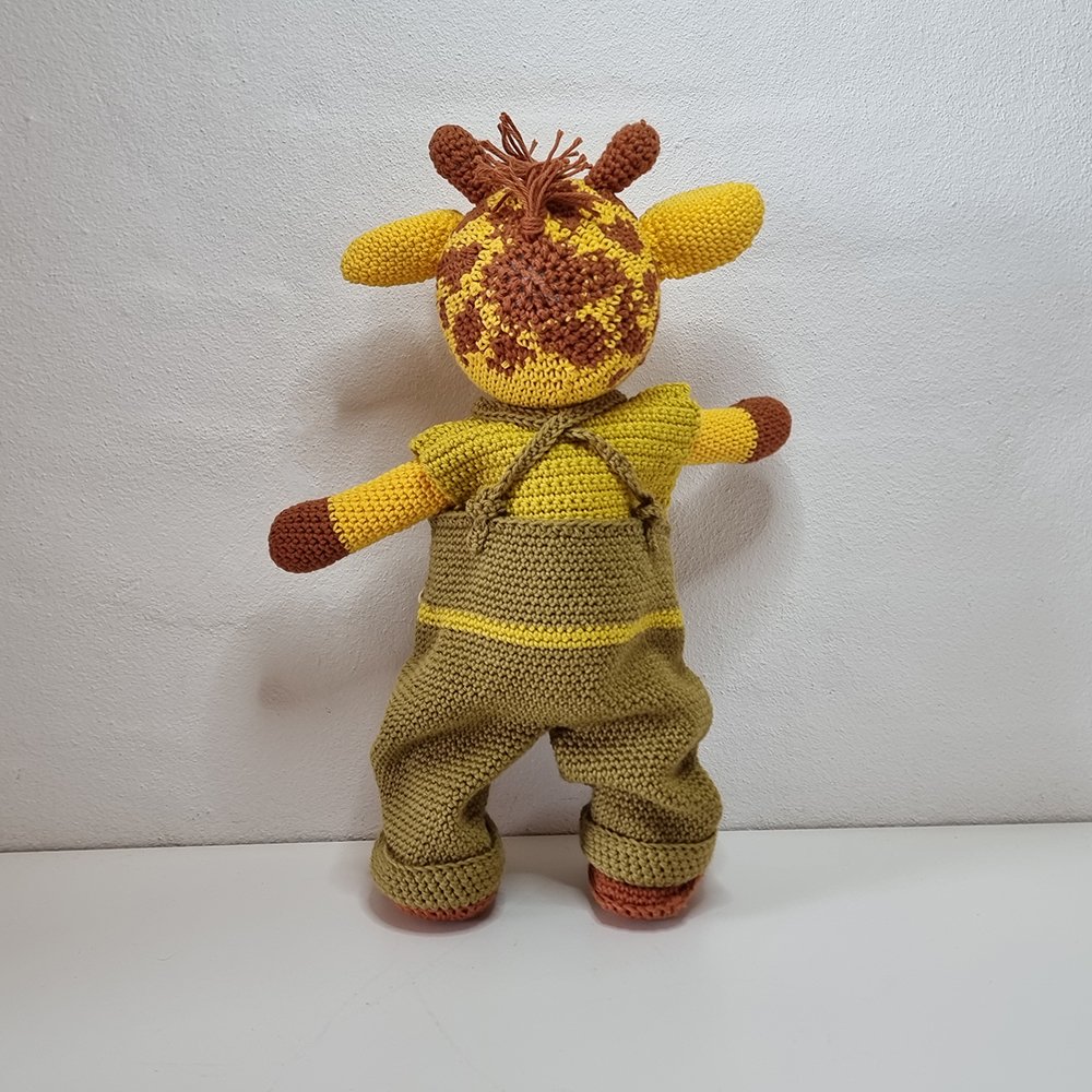 Hæklet Gert Giraf er en sød og håndlavet bamse med bevægelige lemmer, aftageligt tøj og sikkerhedsøjne. Perfekt som gave og til leg.